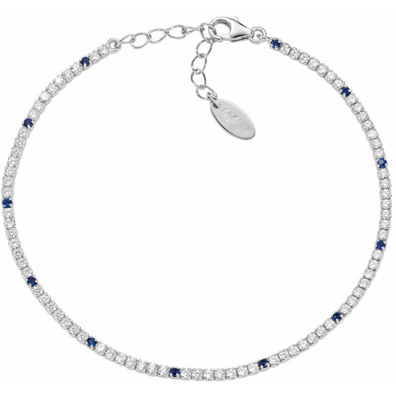 Bracciale tennis Amen realizzato in argento con zirconi bianchi e blu da 1,5 mm e una lunghezza regolabile da 17 a 20,5 cm con catenina di allungo e chiusura a moschettone.