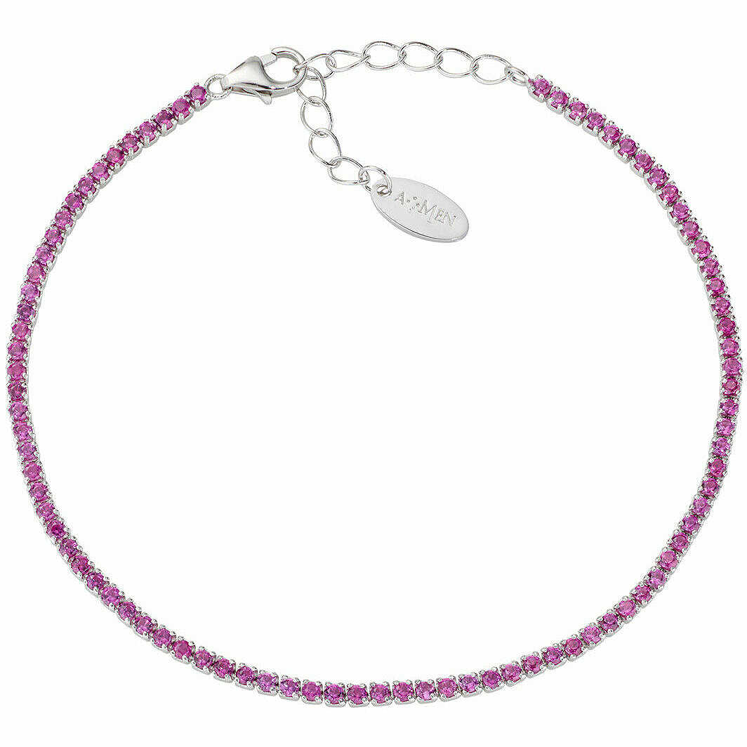 Bracciale tennis Amen realizzato in argento con zirconi fucsia da 1,5 mm e una lunghezza regolabile da 17 a 20,5 cm con catenina di allungo e chiusura a moschettone.