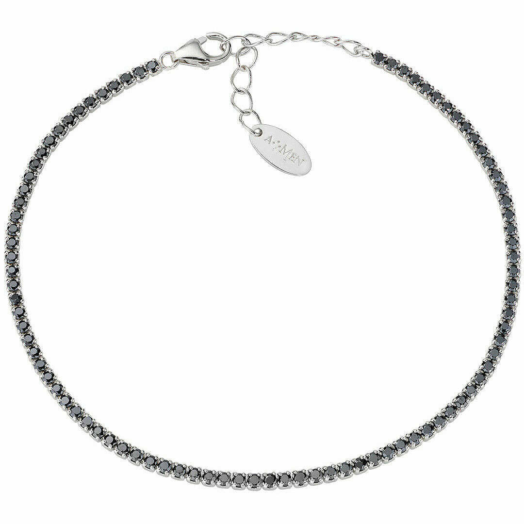 Bracciale tennis Amen realizzato in argento con zirconi neri da 1,5 mm e una lunghezza regolabile da 17 a 20,5 cm con catenina di allungo e chiusura a moschettone.