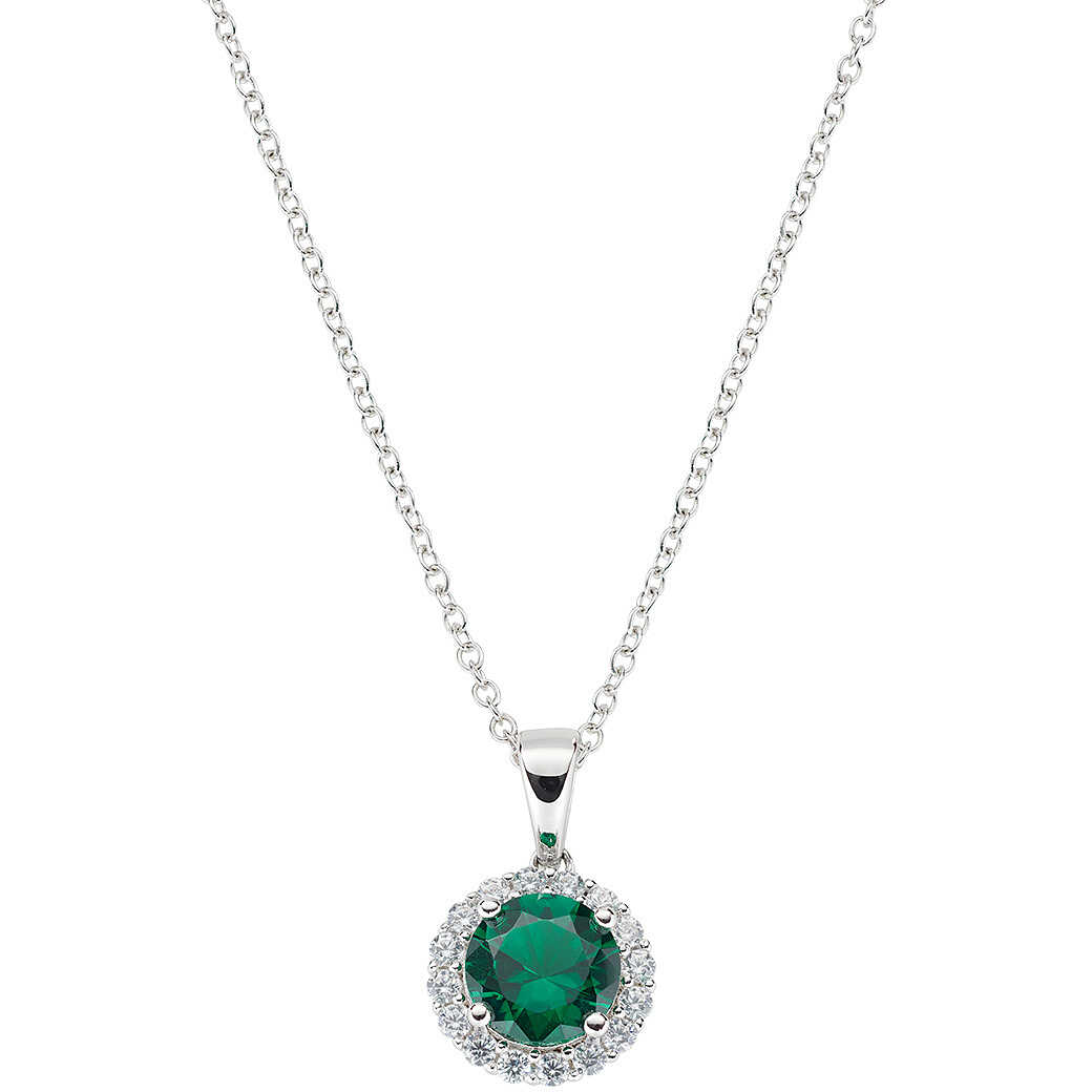 Collana con punto luce in agento e zircone verde smeraldo con contorno di zirconi bianchi. Il ciondolo ha un diametro di 7 mm, la collana è lunga 40 + 5 cm di prolunga con chiusura a moschettone.
