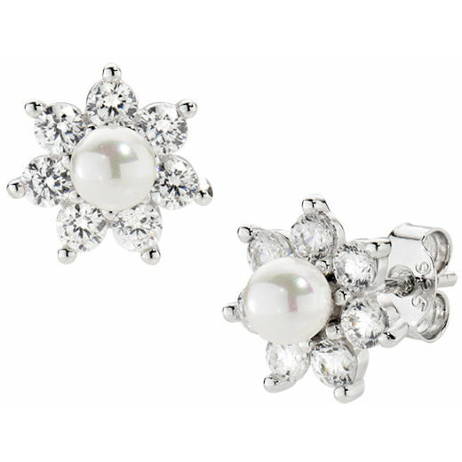 Orecchini a lobo con forma a fiore realizzati in argento con perla centrale da 3 mm, contorno con zirconi bianchi e chiusura a farfallina.