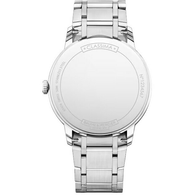 Orologio Baume&Mercier Classima 10883 con cassa in acciaio dal diametro di 40 mm e spessore di 6,05 mm. ll fondello è in acciaio con possibilità di personalizzazione.