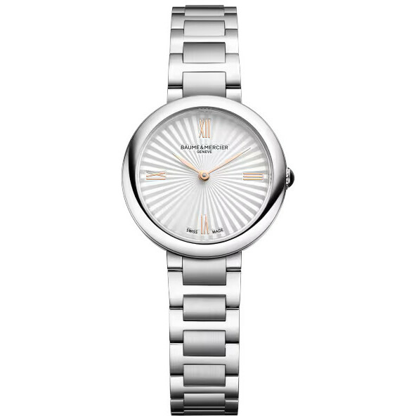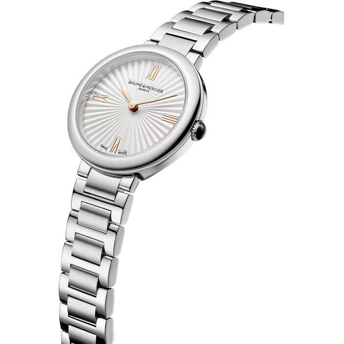Orologio Baume&Mercier da donna realizzato in acciaio con cassa da 28 mm e uno spessore da 7,2 mm. Il cinturino è in acciaio con finiture satinate e lucide.