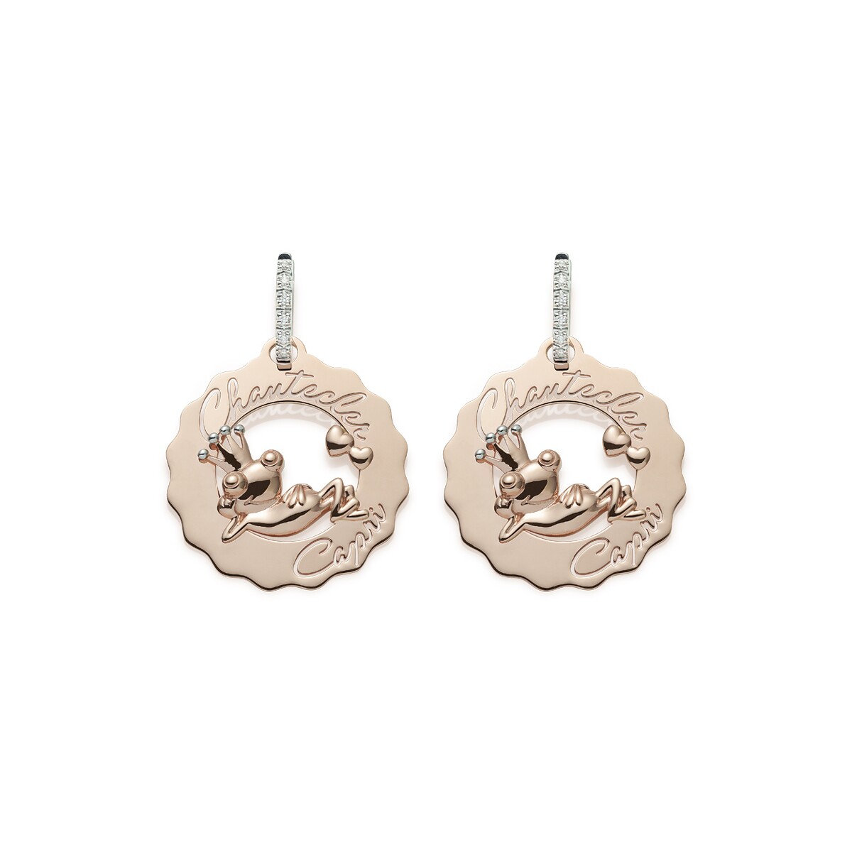 Orecchino Chantecler realizzato in oro rosa 9kt con raggigurato il Principe Ranocchio innamorato e diamanti sulla chiusura per una caratura complessiva di 0,05ct.