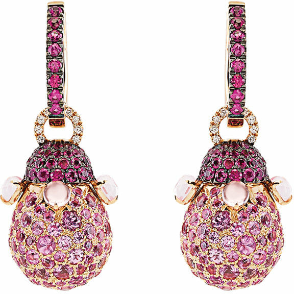 Orecchini Chantecler pendenti realizzati in oro rosa 18Kt. con pavè di zaffiri rosa per una caratura complessiva di 2,98ct. diamanti per 0,06 ct. e cabochon in quarzo rosa.