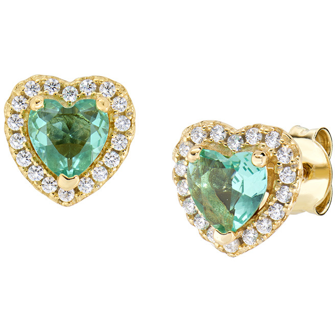 Heart-shaped earrings in gold-plated silver with a central heart-shaped green Emerald Ruby zirconia and a white zirconia outline.