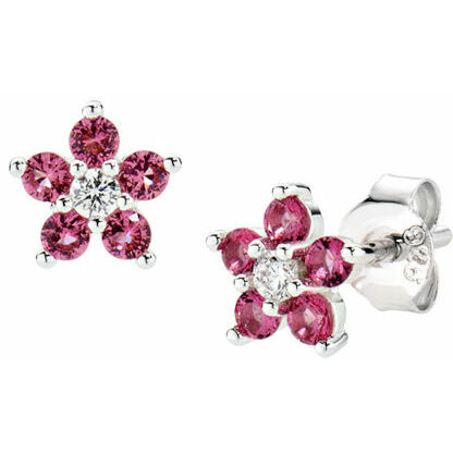 Silver flower earrings with butterfly clasp, central white zirconia and cherry red zirconia forming the petals.
