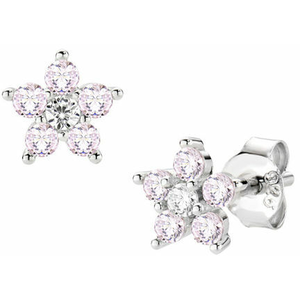 Silver flower earrings with butterfly clasp, central white zirconia and pink zirconia forming the petals.