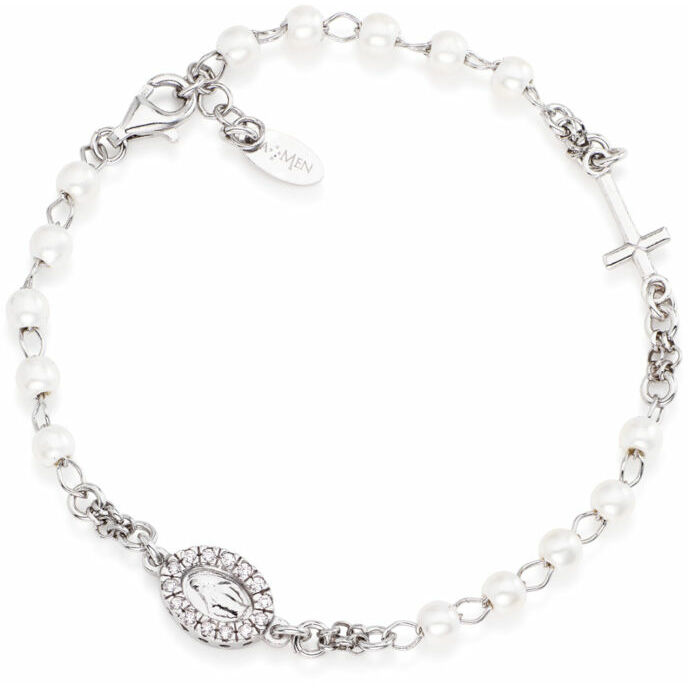 Amen rosary bracelet made of silver with 4 mm pearls and Miraculous medal with zirconia pavé.