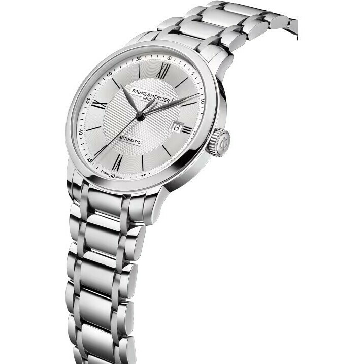 Baume & Mercier Classima 10854 watch with a 40 mm diameter and 9 mm thick steel case. The case back is made of steel with sapphire crystal that reveals the automatic movement. Swiss Made SW200 caliber with a 38-hour power reserve.