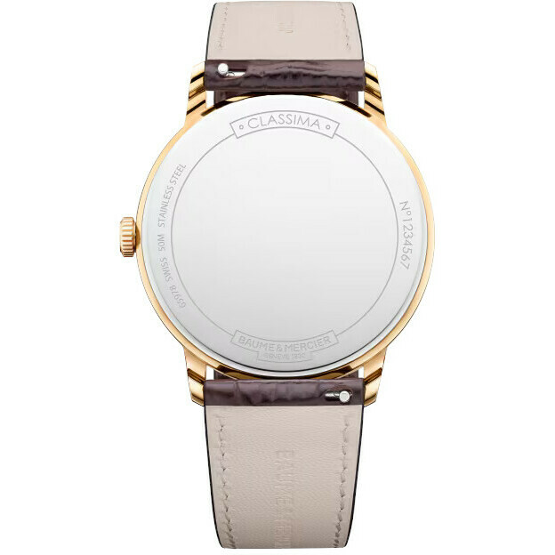 Orologio Baume&Mercier Classima 10857 con cassa in acciaio con trattamento in PVD dorato dal diametro di 40 mm e spessore di 6,05 mm. ll fondello è in acciaio con possibilità di personalizzazione.