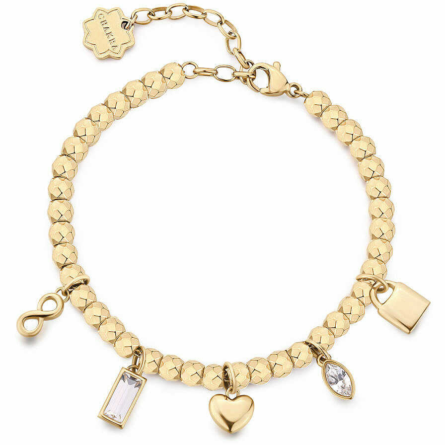 Brosway women's bracelet made of hypoallergenic gold-colored steel with faceted spheres and infinity pendants, heart, padlock and white crystals.