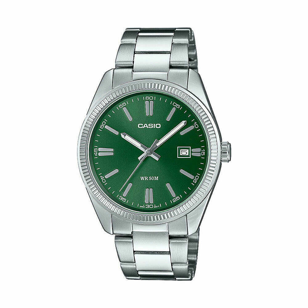This Casio watch has a green dial with steel indexes and hands.