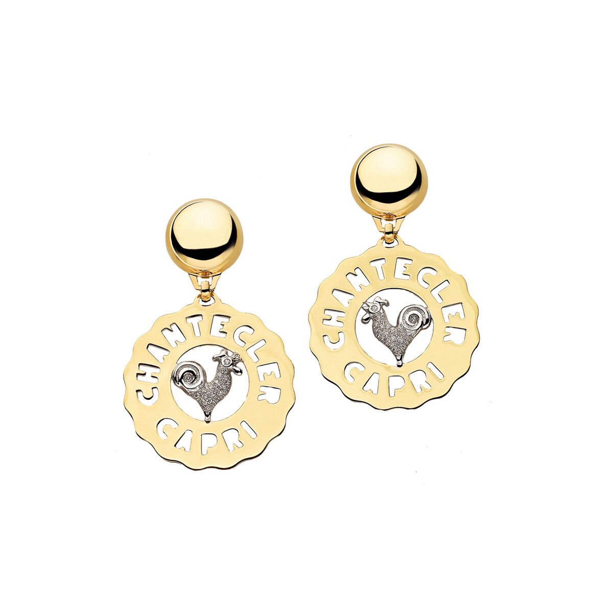 Chantecler Logo medium earrings made of yellow gold and white gold rooster with pavé diamonds for a total carat weight of 0.20 ct.