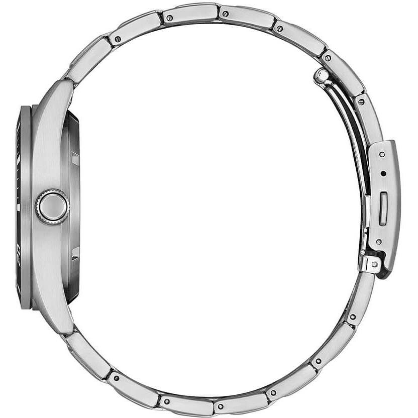Citizen men's watch with a 38.5 mm steel case and black aluminum bezel. The strap is steel and the crystal is mineral.