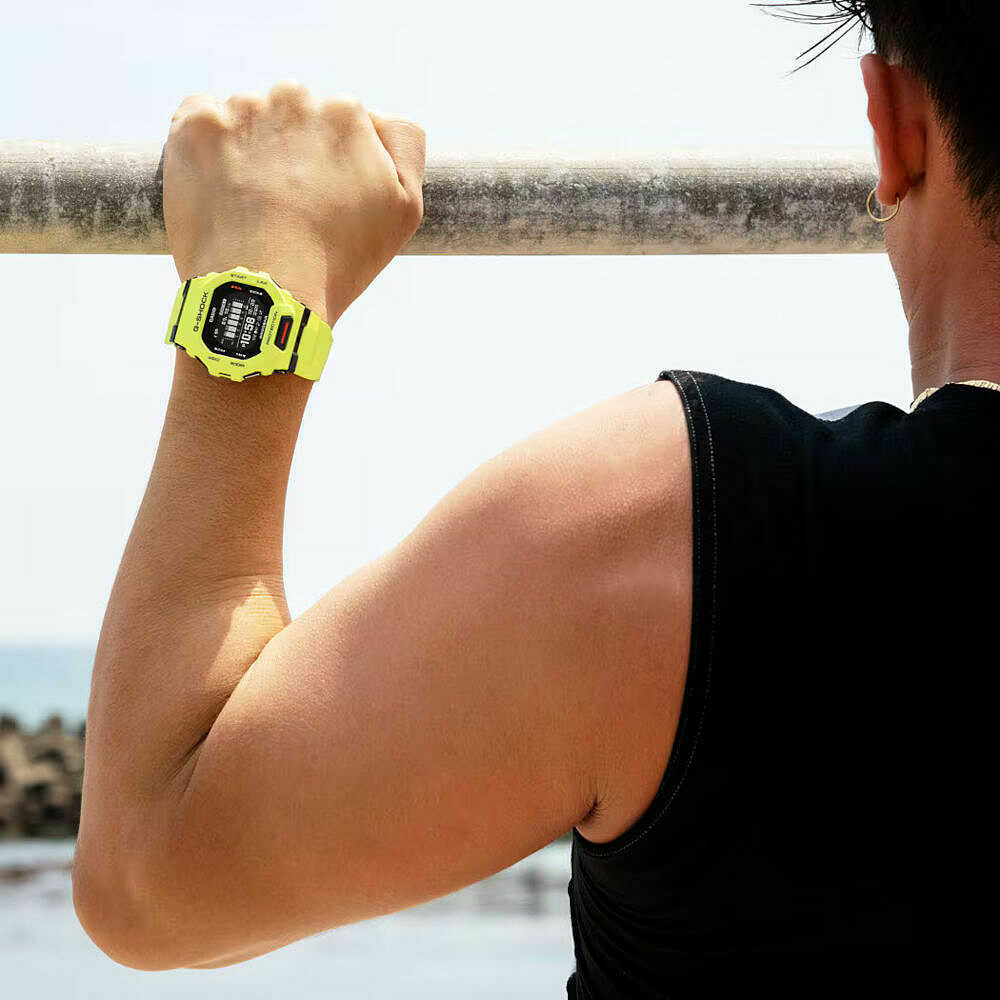 Casio G-Squad watch in fluorescent yellow resin with dimensions of 48.4x45.9x15mm.