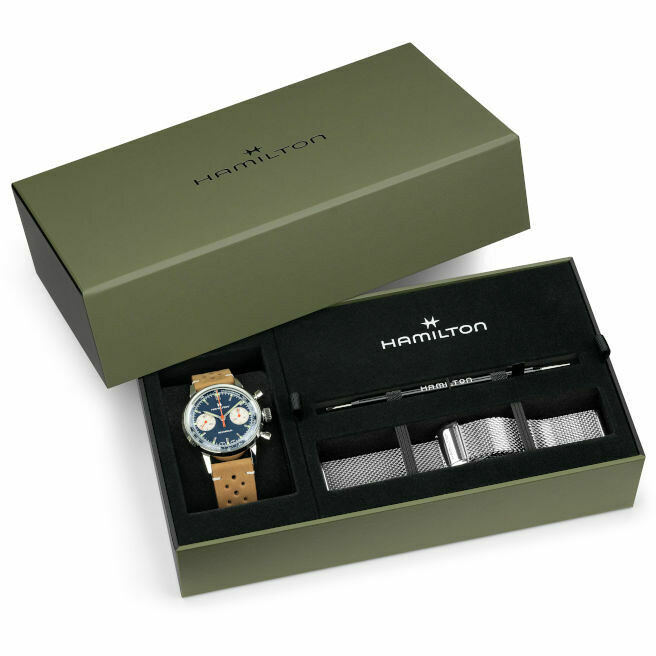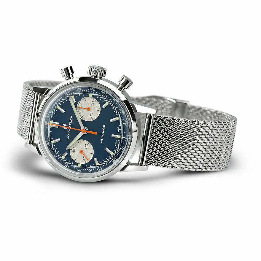 Hamilton Intra-Matic watch with a 40mm stainless steel case and a thickness of 14.35mm. It features a blue dial with white subdials and orange chronograph hands, paired with a perforated leather strap with a classic motorsport design. The box also includes a second Milanese mesh stainless steel strap and a handy tool for changing the strap.