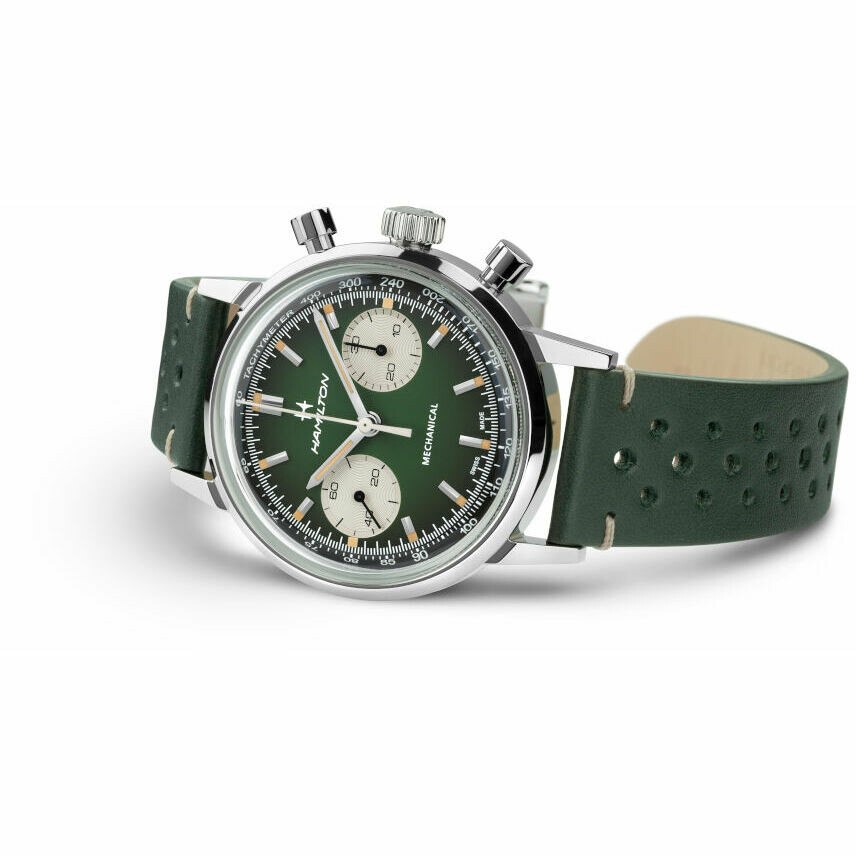 Hamilton Intra-Matic watch with a 40mm stainless steel case and a thickness of 14.35mm. The dial features a deep green and smoked finish, paired with a perforated leather strap with a classic motorsport design. The box also includes a second Milanese mesh stainless steel strap and a handy tool for changing the strap.