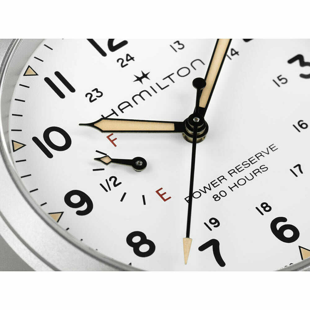 Hamilton Khaki Field Watch Power Reser Made with a 40 mm steel case and a thickness of 11.95 mm. The crystal is sapphire with anti-reflective treatment. The dial is white with power reserve indicators and Super-Luminova indexes and hands.