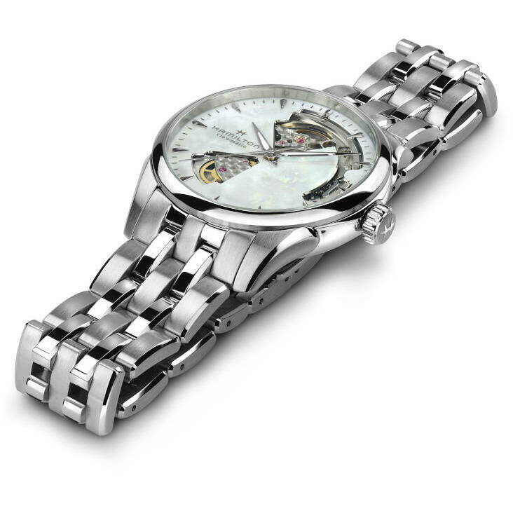 Hamilton Jazzmaster Open Heart watch with 36 mm stainless steel case and sapphire crystal. Featuring a stainless steel bracelet and a white mother-of-pearl dial, the dial design features an open-heart design, revealing part of the finely decorated movement and balance wheel. Gold-tone steel hands and indexes.