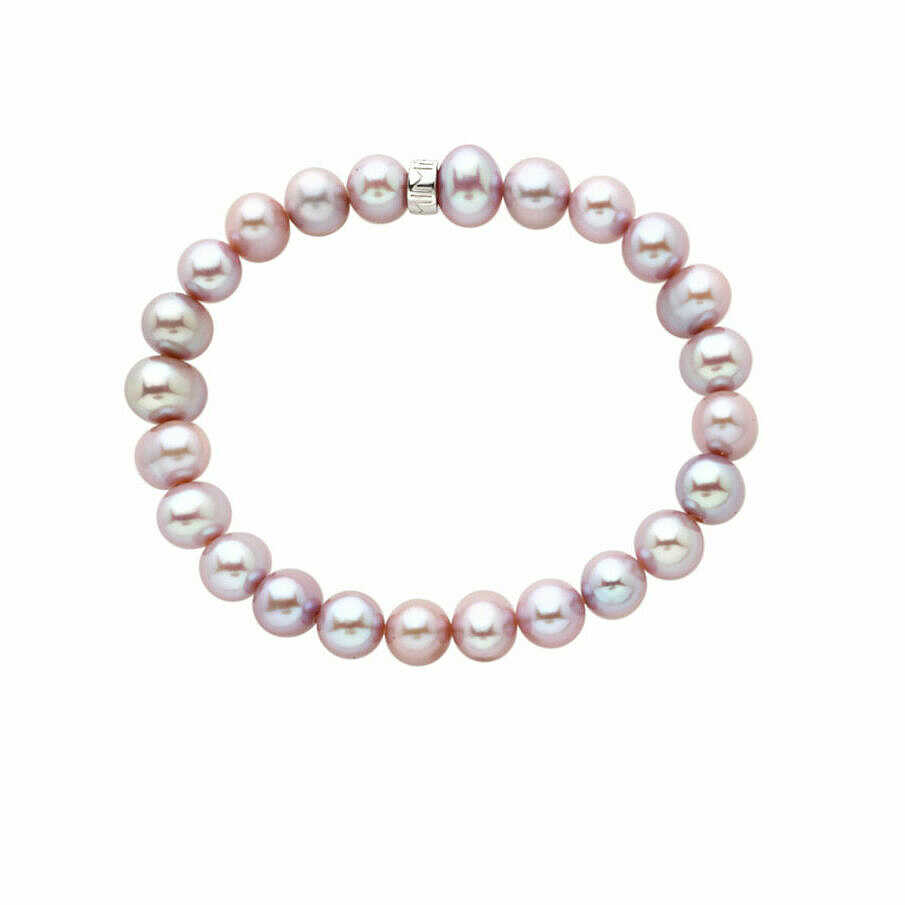 Elastic women's bracelet with purple fresh water pearls with a diameter of 7-8 mm and silver washer with logo.