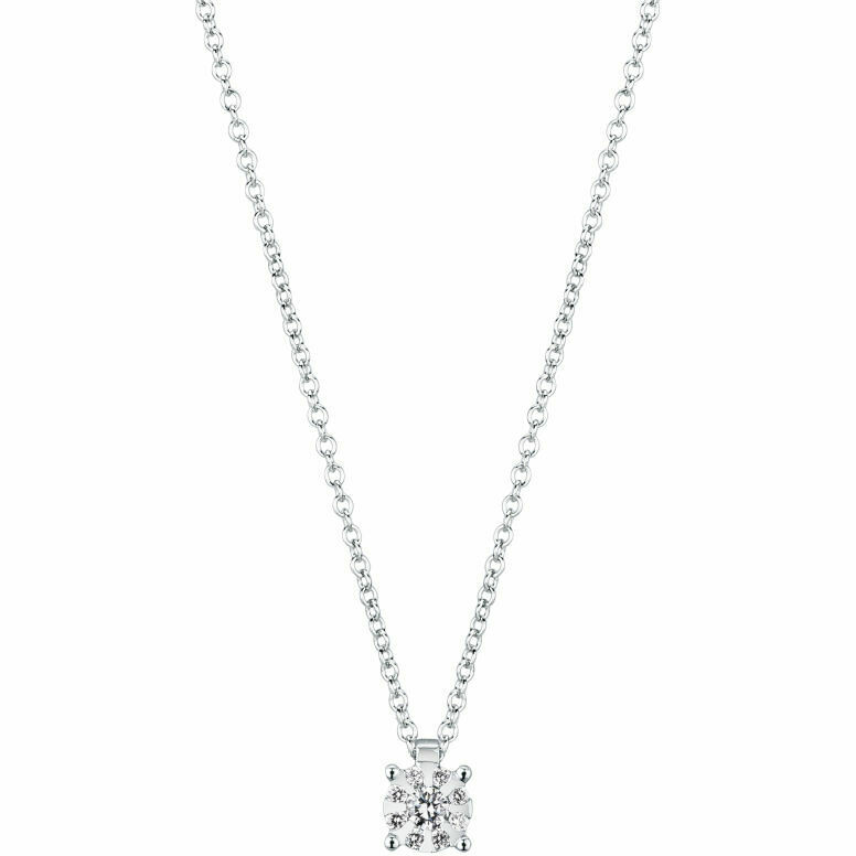 Women's necklace in white gold with a light point pendant made up of a central 0.06 ct diamond. and overall outline of 0.05 ct. Color G clarity VS.