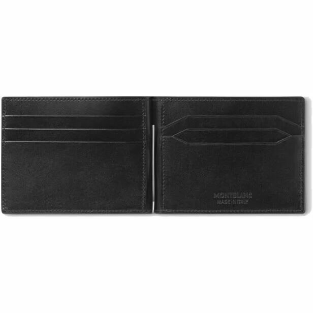 Slim and elegant, this Meisterstück 6-compartment folding wallet features a sleek metal money clip for holding banknotes. Crafted from smooth leather and lined with black fabric, the wallet also features six card slots.