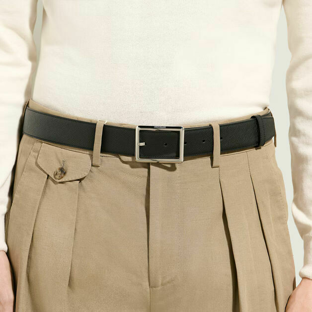 Montblanc Sartorial belt made of embossed leather with one side in classic black and the other in a rich shade of ebony. The buckle is rectangular and has a shiny palladium finish.