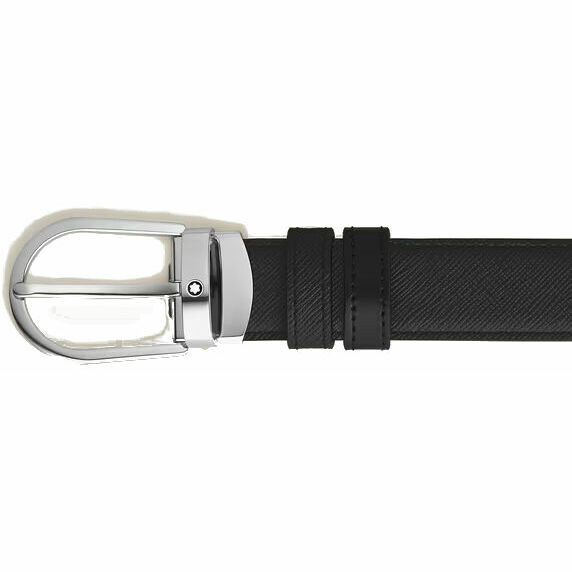 Montblanc belt made of reversible Saffiano-print leather and classic smooth leather. Horseshoe-shaped steel buckle with palladium finish.