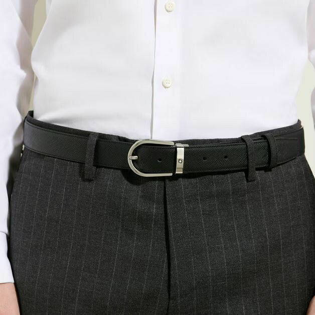 Montblanc Sartorial men's 30mm reversible leather belt, featuring a classic black embossed leather on one side and a sophisticated ebony on the other. The belt is finished with a shiny palladium-finished horseshoe buckle.