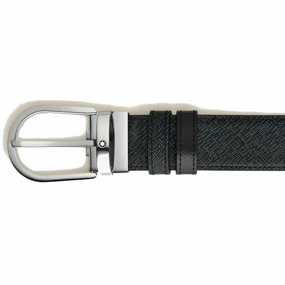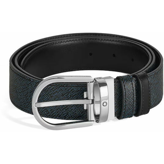This reversible Montblanc belt combines elegance and versatility, offering two distinctive styles in one accessory. Featuring the distinctive palladium-coated Montblanc horseshoe buckle, one side of the 35 mm belt is crafted from tweed-blue Saffiano-print leather, while the other is crafted from exquisite black Meisterstück leather for classic sophistication.