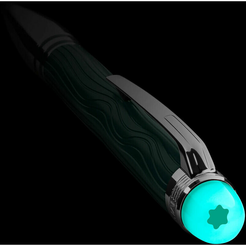 The Montblanc StarWalker Polar Green Doué pen features a wave pattern on precious green resin, beautifully reproducing the iridescent reflections of the Northern Lights, and the matte finish enhances their reflections. The dark green resin rings on the front accentuate the platinum-coated details of the ballpoint pen.