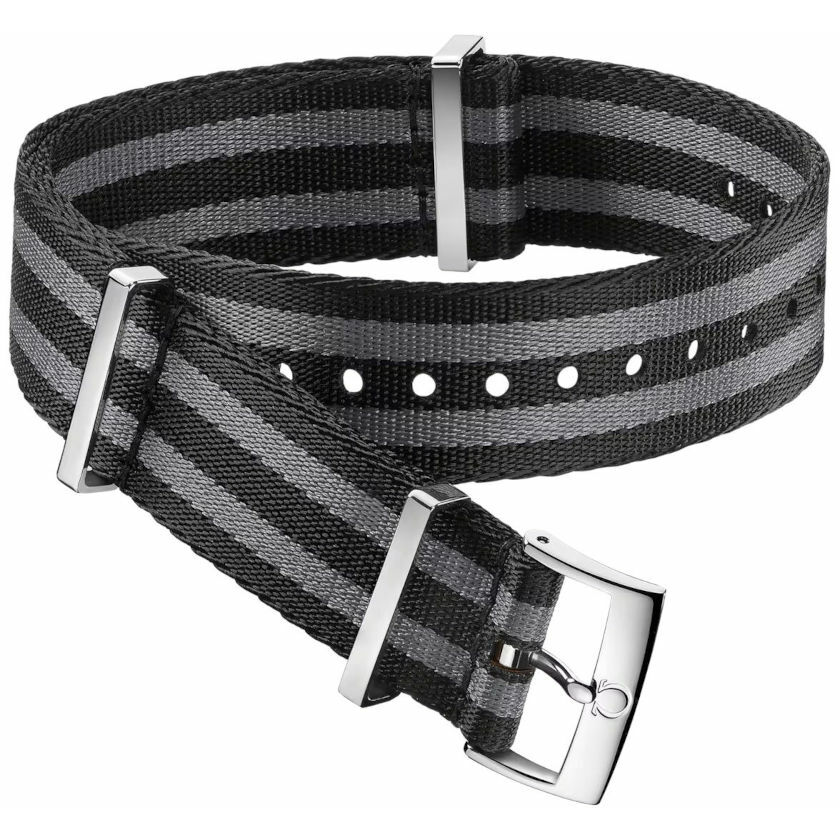 Original Omega grey and black 5-stripe Nato strap with steel pin buckle.