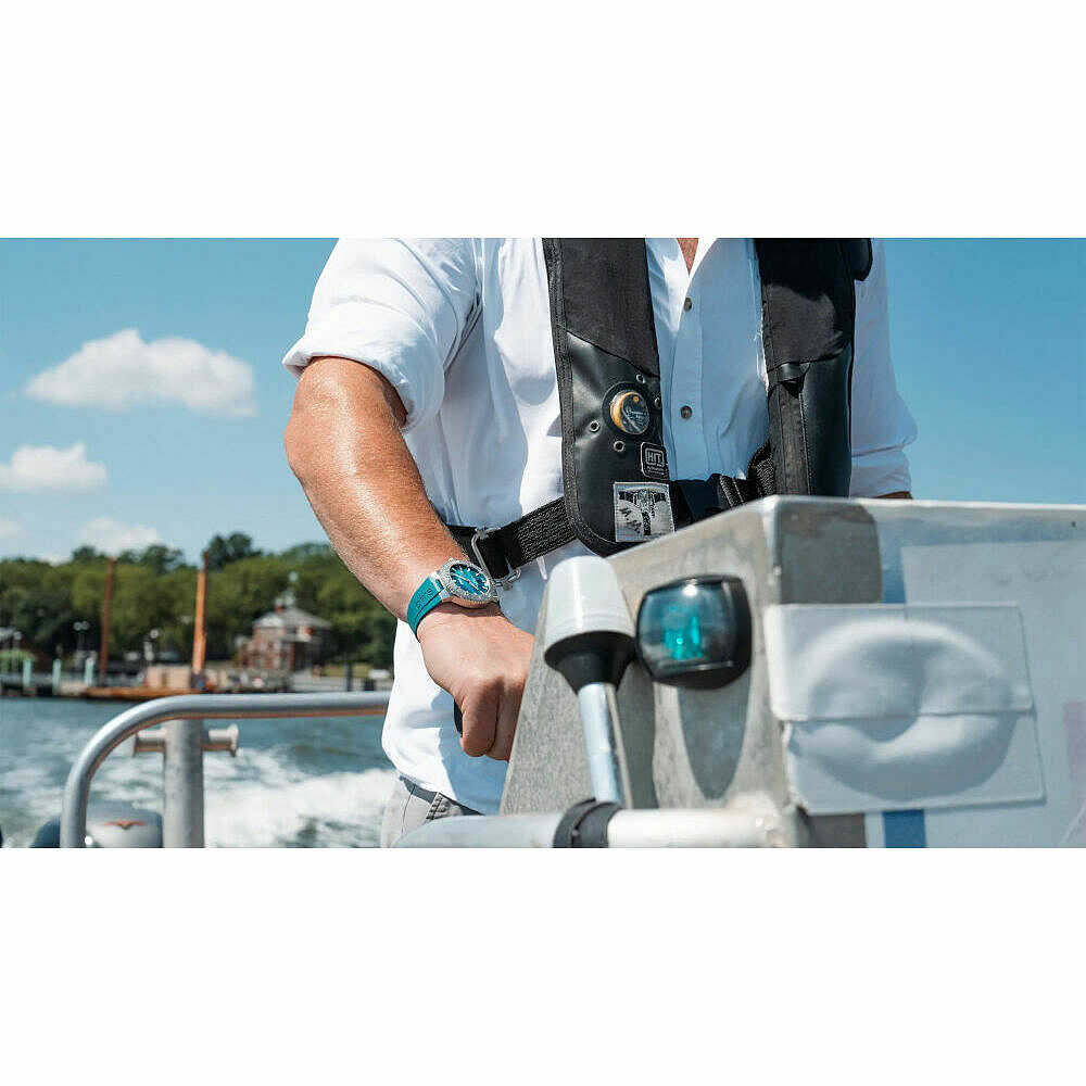 The dial is petrol green in colour, reminiscent of oyster shells, and the hands and indexes are filled with Superluminova.