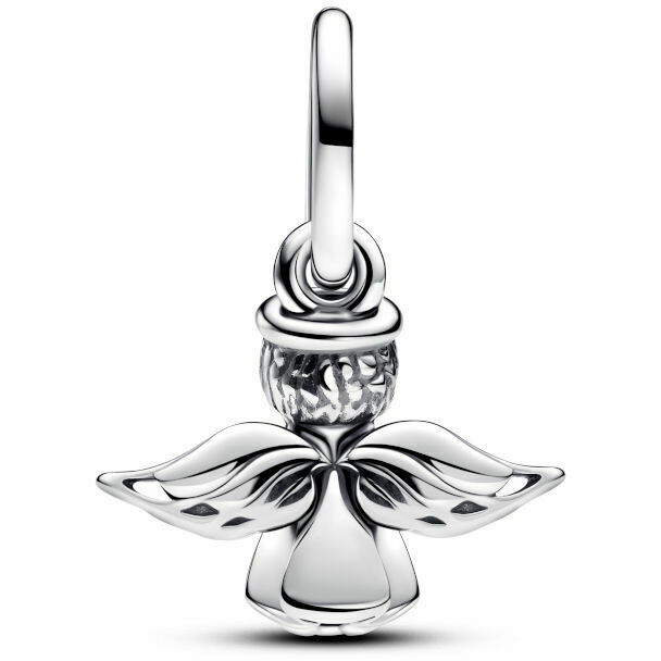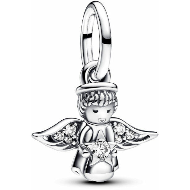 A silver angel with wings decorated with sparkling stones carries a bright star, a symbol of light and hope.