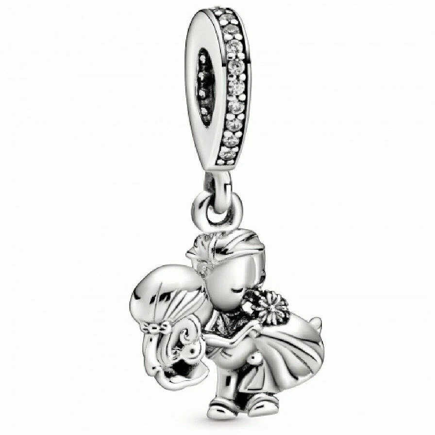 Make that magical moment of saying "I do" last forever with this emotional newlywed couple kissing charm. The groom gently squeezes the bride's hand as she holds the bouquet; the clasp is accented with clear cubic zirconia.