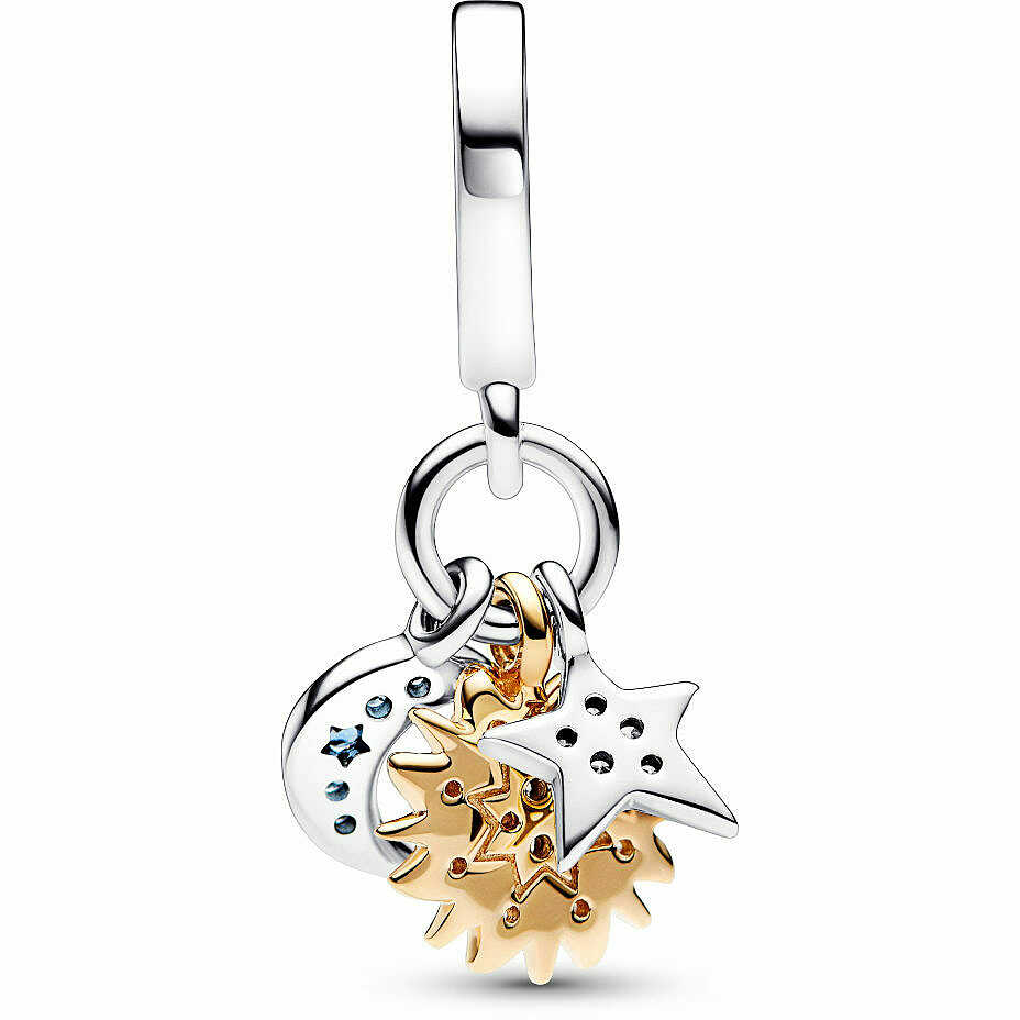 The charm combines a sun-inspired motif crafted from an exclusive 14k gold-plated metal blend and decorated with sparkling stones and micro-spheres, a silver star with luminous pavé, and a silver crescent moon with deep blue stones.