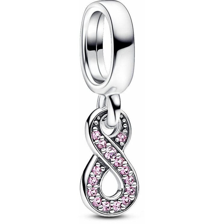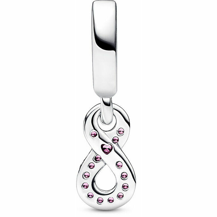 Emblem of an eternal bond, the infinity symbol has been reinterpreted in a slightly asymmetrical shape and is decorated with a row of pink pavé on the front, while on the back it features a heart-shaped cutout where the parts overlap.