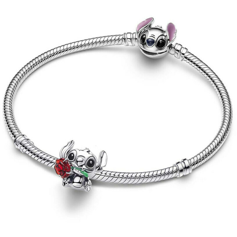 If chaos is your love language, the new Stitch charm is for you. This silver Pandora charm features Stitch with a red Murano glass rose, perfectly expressing his tender yet mischievous spirit.The reference is 794378C01 .
