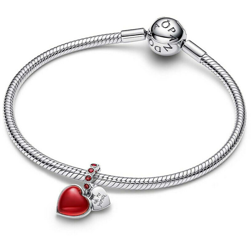 A gift from the heart. This Pandora silver charm features a deep red Murano glass pendant and a second pendant engraved with "YOU ARE MY SOULMATE." Adorned with red crystals, it's perfect for celebrating love and deep connections.The reference is 794429C01 .
