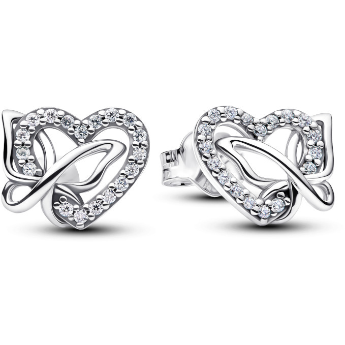 The wings of love. These Pandora silver stud earrings feature an openwork heart and butterfly adorned with 36 sparkling stones. A new intertwined design that symbolizes love and the beauty of change.The reference is 294476C01 .