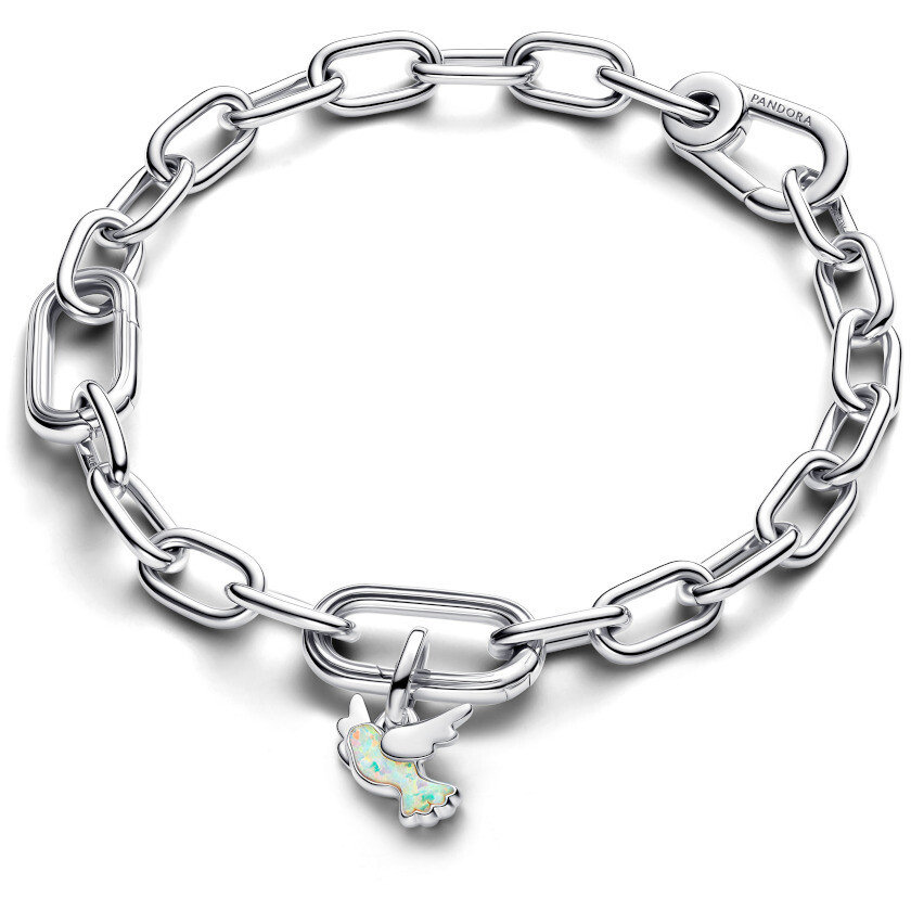 Wear a symbol of peace and love. Crafted from sterling silver with a lab-created white opal, the Pandora mini dangle charm depicts a dove in flight, with open wings, a symbol of harmony and lightness.The reference is 794566C01 .