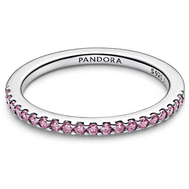 Add a dazzling, delicate touch to your look with this Pandora ring, adorned with a row of pink cubic zirconia stones along the outside of the front half. Wear it alone or layer it with other pavé-embellished pieces for a coordinated look.