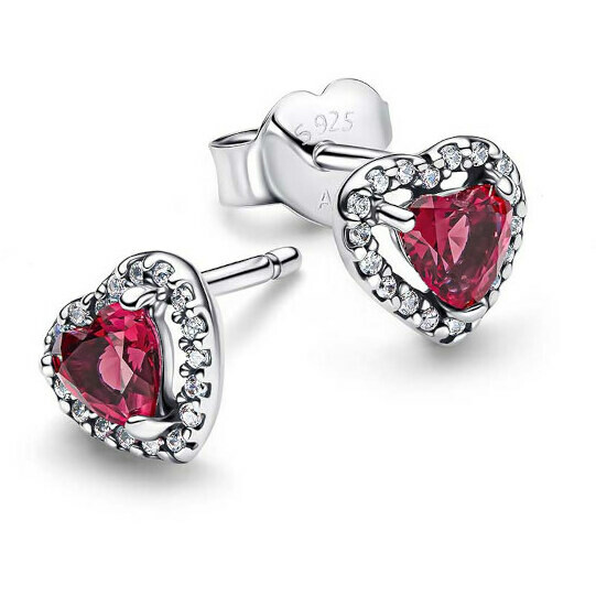 Love is in the details. These Pandora silver earrings feature a red heart-shaped center stone. Subtly raised and surrounded by colorless cubic zirconia, these hearts catch the light and make your face shine.The reference is 298427C04 .