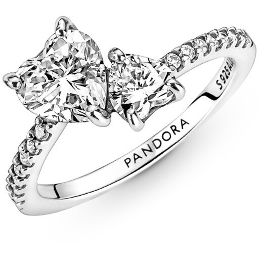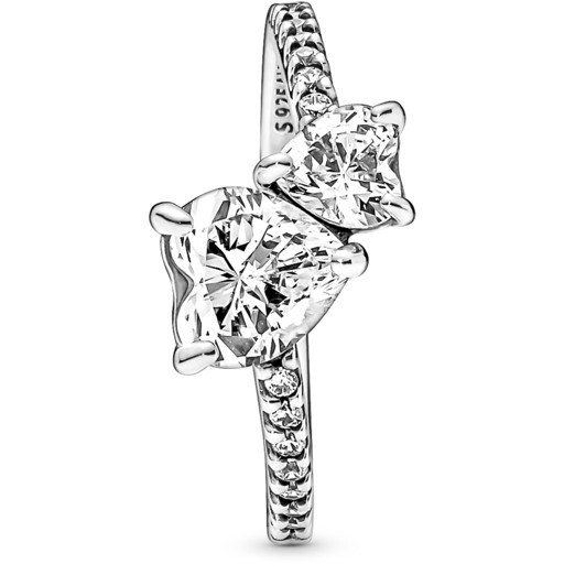 The Pandora Union of Hearts Ring features two heart-shaped clear cubic zirconia stones set at different angles. The ring shank is decorated with a half-row of pavé and is asymmetrically connected to the two hearts for a more modern look.