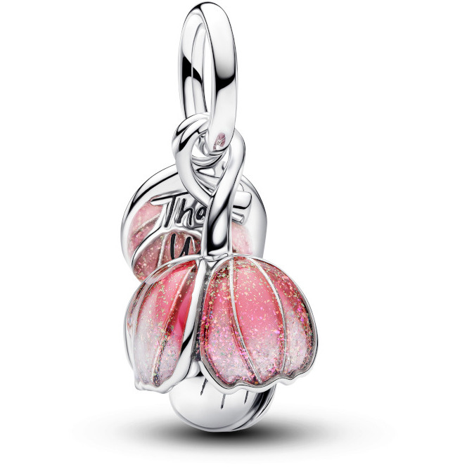Bloom with gratitude. This sterling silver Pandora flower dangle charm opens to reveal three layered petals with a gold-finished center and features a man-made green crystal and sparkling pink resin; the whole thing is finished with "Thank you" engraved on the disc.The reference is 764453C01 .