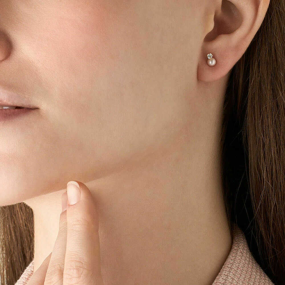 Stroili earrings with 4mm pearls and white zirconia on 4-prong setting in 9Kt yellow gold and silicone butterfly clasp.