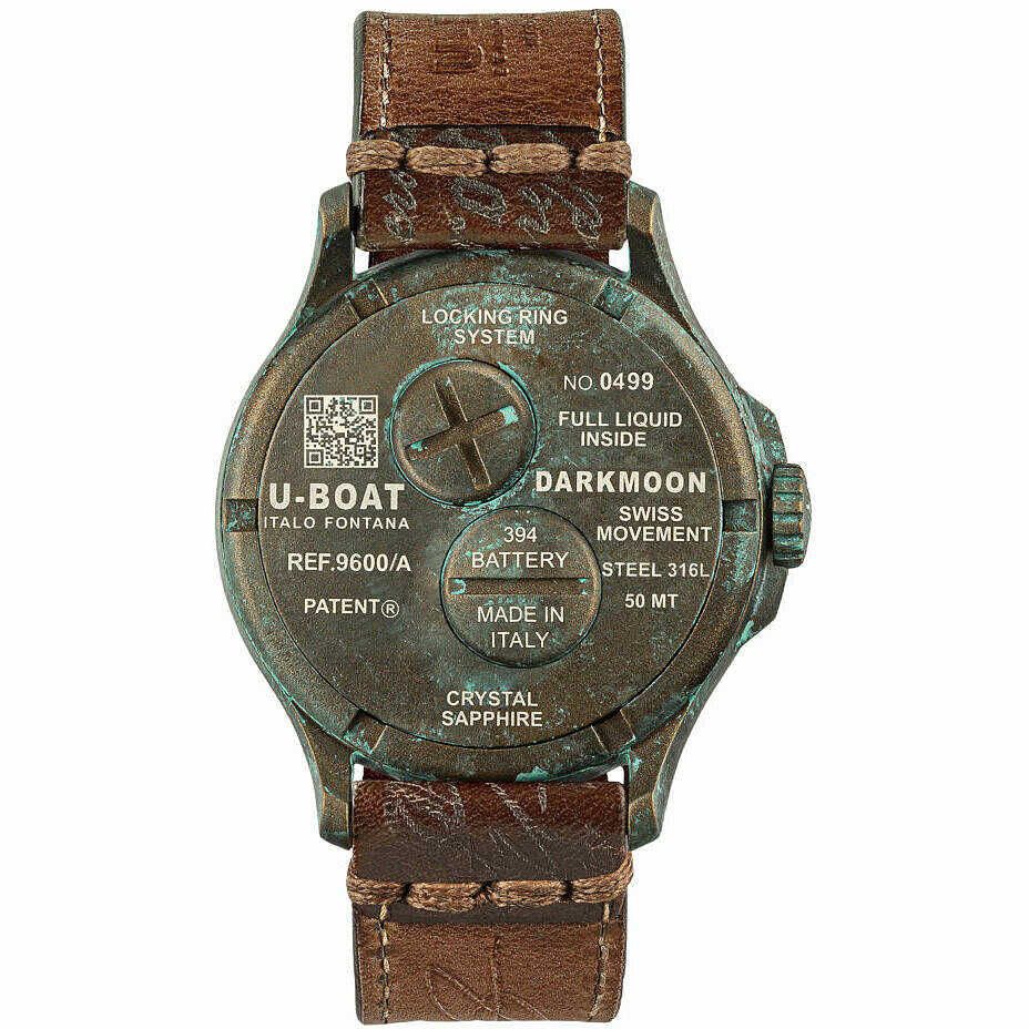 U-BOAT watch featuring a 46.5mm diameter steel case with an aged bronze PVD treatment, completely filled with a special oil that highlights the dial, creating the illusion of a glass-free dial for greater readability. A visible air bubble on the dial compensates for temperature variations. The crystal is sapphire.