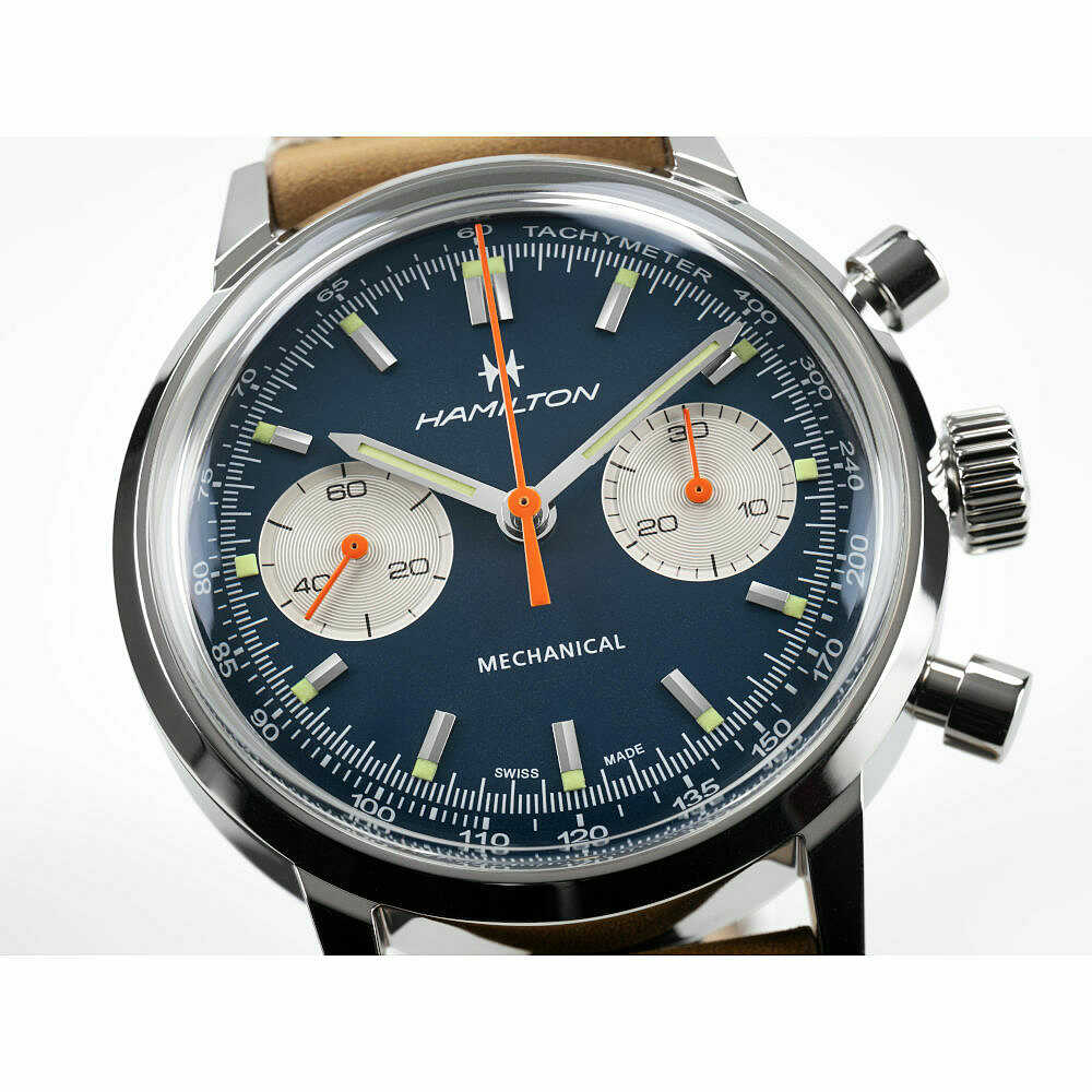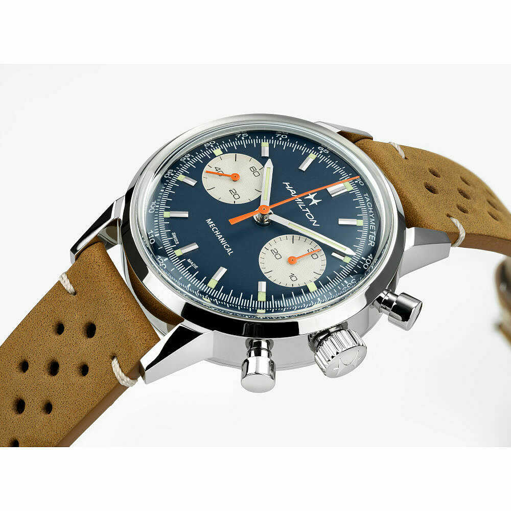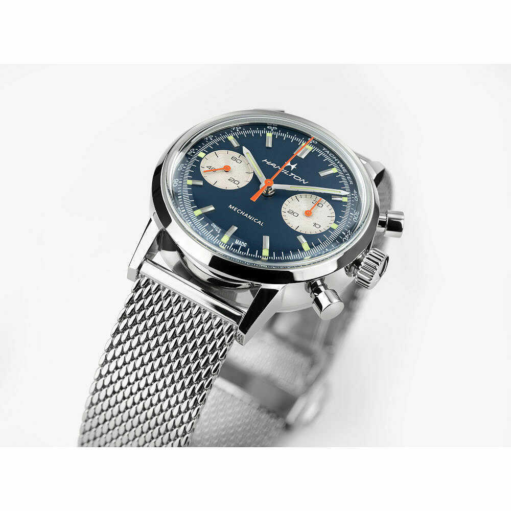 Orologio Hamilton Intra-Matic con cassa in acciaio da 40mm e spessore di 14,35mm. Quadrante di colore blu con contatori bianchi e sfere cronografiche arancioni, il tutto abbinato al cinturino in pelle traforata dal design classico del motorsport, nel cofanetto è presente anche il secondo cinturino in acciaio maglia milanese e un pratico utensile per la sostituzione.