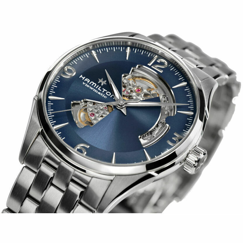 Orologio Hamilton Jazzmaster Open Heart con cassa in acciaio da 42 mm e vetro zaffiro. Cinturino in acciaio e quadrante Blu  traforato così da poter vedere parte del movimento finemente decorato e il bilanciere. Indici e lancette in acciaio.